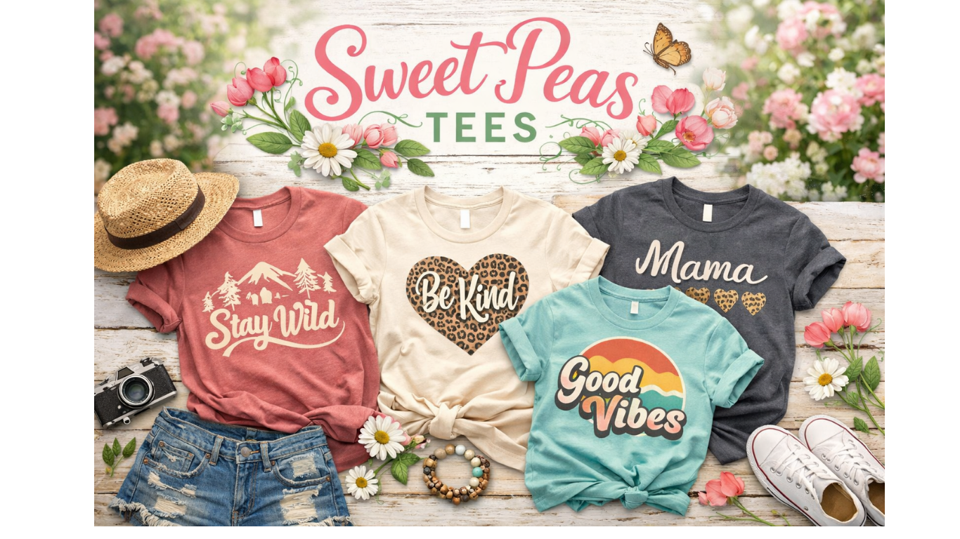 Sweet Peas Boutique Tees are all aboout comfort , style, and everyday confidence. Each tee is thoughtfully selected to be soft, flattering, and easyto wear-perfect for dressing up or keeping it casual. We believe fashion should feel good and reflect your personality, which is why our tees are made to fit real life with charm, quality, and a touch of Southern sweetness.